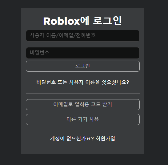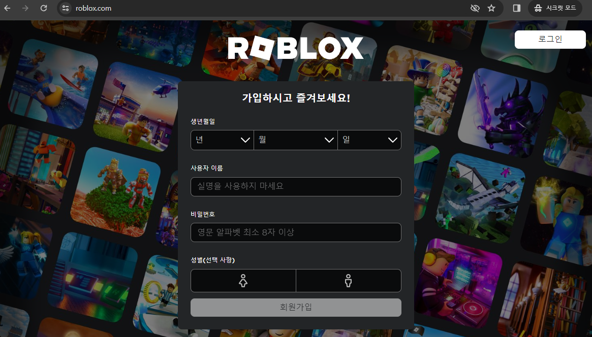 제가 올려드린 파란 버튼을 클릭을 하시게 되면 로블록스 홈페이지로 이동이 되게 됩니다. 이상하게도 게임을 설치하기 위해서는 일단 로그인이 필요해요. 로블록스에 회원가입이 되어 있으시다면 그대로 로그인을 해주시면 되겠고요, 회원가입이 되어있지 않다면 로그인 화면에서 "계정이 없으신가요?" 글귀를 누르시거나, 화면 우측 상단의 "초록색 회원가입버