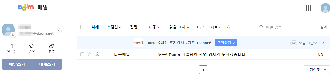 이제는 다음 메인화면에서 메일 옆에 생성 글자가 없어지고 1이 생겼을 텐데요. 클릭해보면 드디어 한메일 바로가기 www.hanmail.net 서비스를 이용할 수 있는 것이죠. 위 사진처럼 말입니다. 여러분들 이제부터 이렇게 매번 번거롭게 인터넷을 켜서 접속하고 로그인하고 하기 귀찮으시죠? 그렇다면 아래의 방법을 추천드립니다.