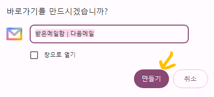 그러면 새로운 팝업창이 하나 뜨면서 "만들기" 버튼이 생기는데 이걸 클릭해주세요. 바탕화면에 한메일 바로가기 www.hanmail.net 아이콘이 생성되었을 것입니다. 이제부터 컴퓨터 껐다 키실때 메일을 보고싶으시다면 저걸 더블클릭해주세요. 한메일 메일함으로 바로 이동될 것입니다!