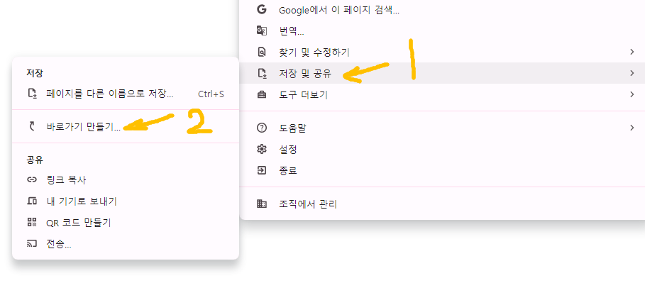 그리고 하단에 보면 저장및공유 라는 글자를 클릭하신 뒤 바로가기 만들기를 눌러주세요.