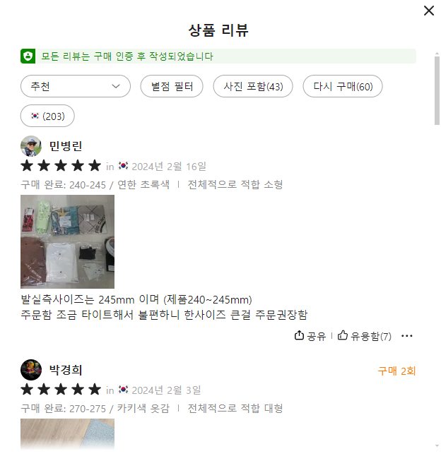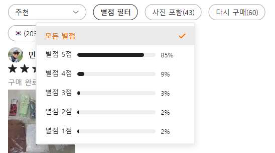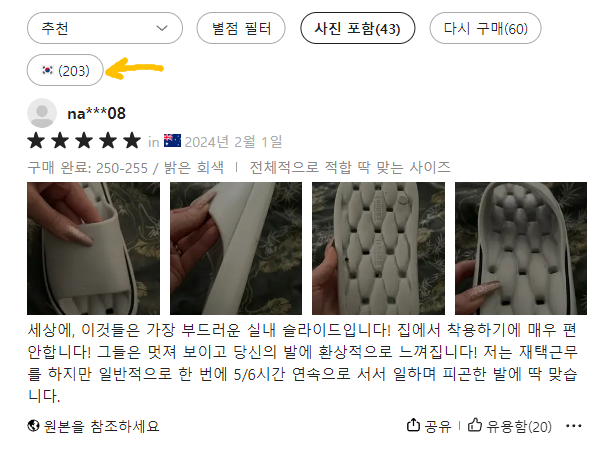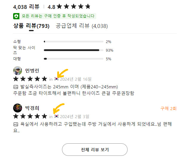 temu 쇼핑몰 후기를 보실 때는 한국인 분들이 쓴 리뷰를 보시는게 좋겠죠. 아무래도 글로벌 사이트이다보니 미국, 중국, 인도 등 전세계적으로 리뷰가 공통적으로 남겨진다고 합니다. 일단 "전체 리뷰 보기"를 눌러보실까요? 그럼 조그마한 모달팝업창이 뜨게 됩니다. 여기서 사람들이 남긴 후기를 살펴보시면 좋아요. 그런데 이 제품은 특이하게도 한국분들이 많이 쓰셨는데, 외국 리뷰가 원래 많습니다. 따라서 나중에 스킬을 하나 알려드릴거에요.